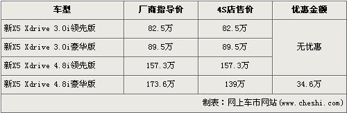 據(jù)經(jīng)銷商處銷售人員介紹,近期購買X5的消費(fèi)者可以得到最高34.6萬元的優(yōu)惠。新款的寶馬X5 3.0i領(lǐng)先版車型、3.0i豪華版和4.8i領(lǐng)先版店內(nèi)均無現(xiàn)車,4.8i豪華版經(jīng)34.6萬元優(yōu)惠后,售價(jià)從173.6萬元下降到了139萬元。