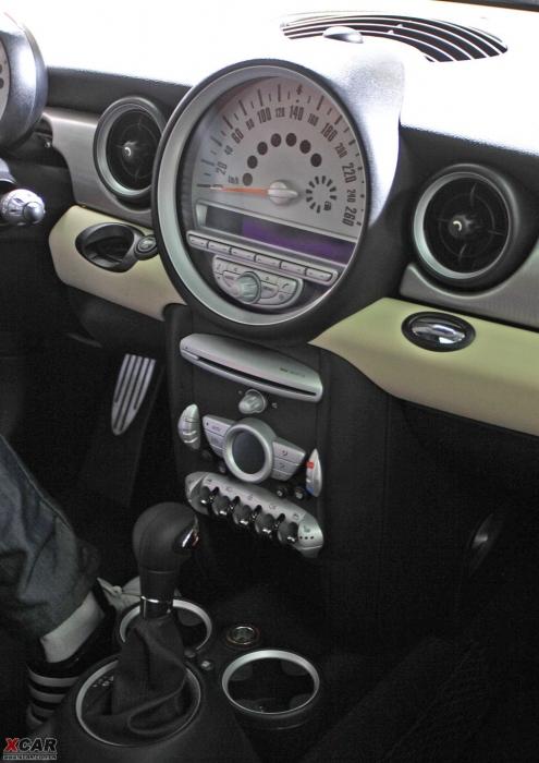 坐進(jìn)MINI的車內(nèi),一個(gè)圓形的白色大儀表盤非常惹眼,可電子顯示車速、油量、冷卻劑以及其他功能狀態(tài)等信息。這種布局自從1968年以來一直是MINI典型特征?刂婆_(tái)下方帶有6個(gè)條形小開關(guān)是從原創(chuàng)MINI繼承而來的,這些開關(guān)均為彈簧式按鈕,使用后自動(dòng)彈回原來狀態(tài)。