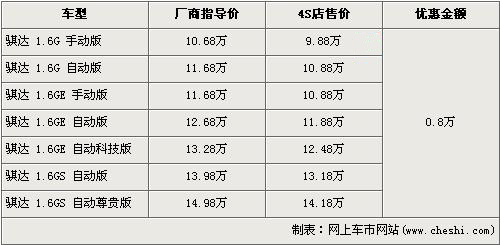 據(jù)東風(fēng)日產(chǎn)4s店銷售人員介紹,目前東風(fēng)日產(chǎn)騏達(dá)全系優(yōu)惠9000元。經(jīng)優(yōu)惠后,入門級的1.6G手動(dòng)版售價(jià)下降到了9.88萬元,而全系最高配的1.6 GS自動(dòng)尊貴版售價(jià)也降到了14.18萬元。銷售人員還介紹,目前店內(nèi)沒有騏達(dá)現(xiàn)車,欲購買者需交2000元訂金約等1個(gè)月時(shí)間。
