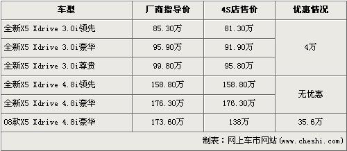 據(jù)經(jīng)銷商處銷售人員介紹,店內還有一輛售價為173.6萬元的08款X5 4.8i豪華版現(xiàn)車,目前此批車有35.6萬元的優(yōu)惠,經(jīng)優(yōu)惠后售價降到了138萬元。銷售人員還介紹,新款X5-30i車型有4萬元的優(yōu)惠,4.8i車型沒有優(yōu)惠。