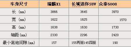 瑞麒X1定位于奇瑞首款微型SUV產(chǎn)品,長寬高分別達(dá)到3866×1622×1638mm,軸距也達(dá)到了2330mm。體積在三車中低于眾泰5008,但高于長城迷你SUV。