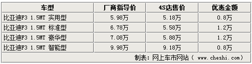 作為比亞迪汽車旗下的重點(diǎn)產(chǎn)品,比亞迪F3在今年又推出了智能白金版,新款車型增加了無鑰匙系統(tǒng)、智能娛樂通訊系統(tǒng)等高端配置,使這款自主品牌家用轎車的競爭力更加突出。網(wǎng)上車市網(wǎng)站了解到,雖然比亞迪F3智能白金版上市時間不長,但目前優(yōu)惠幅度有所提升,經(jīng)銷商處全系最高可給出1.2萬的優(yōu)惠。詳情如下: