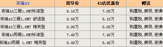 全新的2010款奇瑞A3于近日正式上市,全系均添加了ESP并在內(nèi)外裝飾上有了更多的亮點。筆者從奇瑞汽車經(jīng)銷商了解到,2010款A(yù)3目前現(xiàn)車很少,現(xiàn)在預(yù)訂要等到明年1月初提車,目前價格上沒有優(yōu)惠。不過店內(nèi)還有部分老款庫存車型,其中三廂車型在享受最高5000元優(yōu)惠的同時還可贈送多重優(yōu)惠,包括送全額購置稅,價值3000元左右的外牌以及國產(chǎn)全車貼膜、倒車雷達裝潢等等,禮包實惠價值超過了8000元。