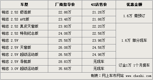 據(jù)一汽豐田4S店銷售人員介紹,目前銳志可優(yōu)惠1.6萬元,現(xiàn)車比較齊全,一般購買車型主要集中在舒適版和紀(jì)念版,消費(fèi)者可根據(jù)需要選購。另據(jù)介紹,新銳志車型要在明年4月北京車展亮相,之后2個月左右才可以購買到,并且新款車型剛上市不會有現(xiàn)款這么大的優(yōu)惠空間,目前購買現(xiàn)款銳志也是一個不錯的選擇。如消費(fèi)者有意購買,到店詳談會有更優(yōu)惠的價(jià)格。北京地區(qū)各4S店由于訂單不同,各店銷售的現(xiàn)車顏色有所不同。