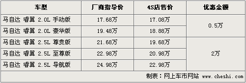 據(jù)一汽馬自達4S店銷售人員介紹,馬自達6睿翼目前全系車型最高可以優(yōu)惠現(xiàn)金2萬元,2.5排量三款車優(yōu)惠后最低僅售19.68萬,其中2.0排量車型目前也可以優(yōu)惠現(xiàn)金5千元。本月底經銷店內有黑色、銀色、紫色等現(xiàn)車供應。