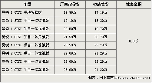 據(jù)斯柯達(dá)經(jīng)銷店銷售人員介紹,斯柯達(dá)昊銳共分為8個車型,售價區(qū)間為17.99-25.09萬元。目前店內(nèi)昊銳全系有8000元的現(xiàn)金優(yōu)惠,經(jīng)優(yōu)惠后,昊銳的售價區(qū)間降為了17.19萬-24.29萬,并且店內(nèi)的昊銳現(xiàn)車比較充足,消費(fèi)者挑選的空間也較大。