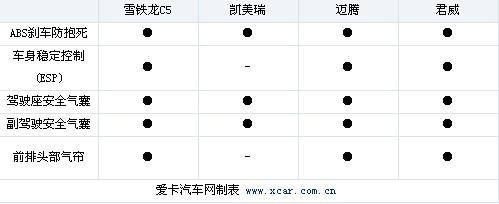 車型的安全性配置是購買者非常關(guān)注的一個因素,我們?yōu)榇蠹疫x取了五種較為常見的主被動安全配置進(jìn)行比較。
