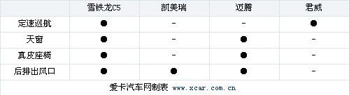 總的來看C5的配置單還是比較有誠意的,基本能做到“人無我有”。比較尷尬的是凱美瑞,作為一款2.4L,價格在20萬左右的中級車型,標(biāo)配里不含真皮座椅,也許會讓一部分消費(fèi)者望而卻步。