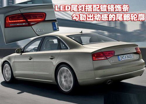 通過奧迪新A8車型的尾部可以看出,全新的LED分體式尾燈搭配全新后保險杠的鍍鉻裝飾條,勾勒出其充滿活力與動感的尾部輪廓。
