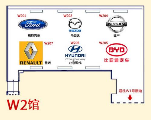 在本屆北京車(chē)展,W2館有日產(chǎn)、現(xiàn)代、馬自達(dá)、比亞迪汽車(chē)、福特汽車(chē)、雷諾等共6個(gè)品牌參展,主要亮點(diǎn)車(chē)型:日產(chǎn)LEAF、日產(chǎn)Juke、北京現(xiàn)代RC、北京現(xiàn)代i50、馬自達(dá)馬自達(dá)8、比亞迪S6/L3、福特銳界、福特新?怂挂约袄字Z新梅甘娜CC等。