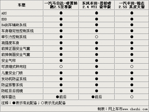 隨著汽車市場的日益成熟,安全能力逐漸也成為了車主最為關(guān)心的問題?梢钥闯鯝BS+EBD和6安全氣囊均成為了這三款車型的標(biāo)準(zhǔn)配置。但仔細(xì)看下來,睿翼轎跑和思鉑睿的配置還是更加的全面,在配備后倒車?yán)走_(dá)同時還配備了前部停車?yán)走_(dá),,進(jìn)一步保證停車時的安全。值得一提的是這三款車型都配備了車輛行駛動態(tài)控制系統(tǒng),該項配置可以大大的降低車輛行駛中,因側(cè)滑而發(fā)生的事故,尤其是睿翼轎跑和銳志還配備了牽引力控制系統(tǒng)。在細(xì)節(jié)方面三款車同樣十分到位,都配備的后排兒童安全門鎖、防眩目后視鏡等。
