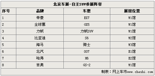 這其中,吉利帝豪品牌有EX7、GX5兩款SUV推出,而比亞迪S6也終于將在車展亮相,海馬騎士將在車展正式上市,北汽集團(tuán)將推出自主SUV-007,長城汽車依托原有越野車領(lǐng)域的優(yōu)勢,將在車展推出高端SUV車型H6,這8款SUV車型從小到大,涵蓋了從城市到越野SUV的不同類型車款,滿足消費(fèi)者的個性需求。