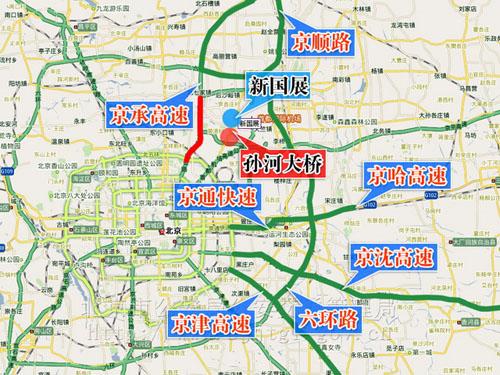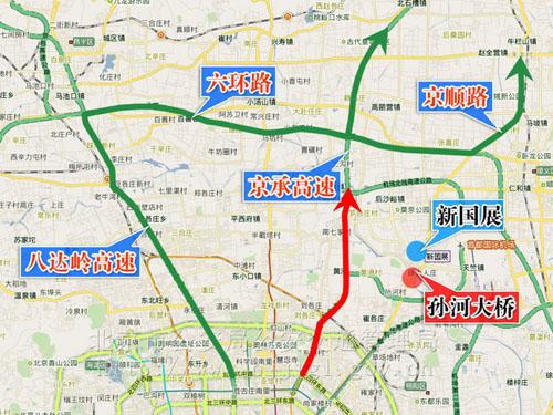 六、由于車展期間京承高速路車流量大,京密路孫河大橋路面施工,易造成交通擁堵。為避免過境車輛和前往懷柔、密云、平谷、承德等方向旅游車輛長時間滯留,可分別由下列道路繞行: