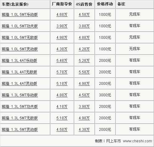 作為全球鷹旗下首款產(chǎn)品,吉利熊貓自上市以來(lái)就廣受年輕消費(fèi)者的關(guān)注。很多消費(fèi)者不難看出,吉利熊貓時(shí)尚靚麗的外形,與憨態(tài)可掬的熊貓非常相似,給整車(chē)帶來(lái)很多可愛(ài)的元素,符合時(shí)下年輕消費(fèi)者的購(gòu)車(chē)需求。網(wǎng)上車(chē)市近期走訪(fǎng)北京地區(qū)吉利4S店,了解到了吉利熊貓最新的市場(chǎng)信息,具體情況請(qǐng)參考下表: