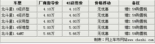據(jù)昌河鈴木4S店銷售人員介紹,北斗星車型由于深受人們喜愛,關(guān)注的程度也比較高,店內(nèi)為保證使用者及時(shí)提車,全系車型均有大量庫存。到店購車可以獲得2.5%的購置稅贈送,以價(jià)格最便宜的1.0L經(jīng)濟(jì)型為例,2.5%的購置稅相當(dāng)于購車優(yōu)惠了1025元,其他車型以此類推。另外,到店購車還可能會有更大幅度的優(yōu)惠政策,希望大家到店看車試駕。