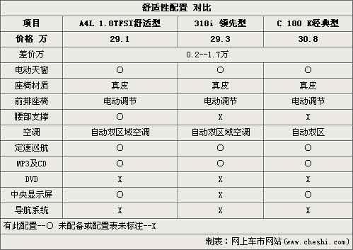 為了讓駕駛變得更輕松讓旅程變得更愜意,高端轎車一般都會(huì)具備較為全面的舒適娛樂(lè)設(shè)施。這三款車型基本上都是車系的入門產(chǎn)品,因此在配置上豪華型有所欠佳,實(shí)用性上也全部沒有配備GPS導(dǎo)航系統(tǒng)和DVD播放功能。不過(guò)3款車型均把一觸式防夾車窗、4門一觸式車窗、CD機(jī)作為了標(biāo)準(zhǔn)配備,進(jìn)一步豐富了整車的功能性和娛樂(lè)性。其中奧迪A4L還提供了中央顯示屏以及雙區(qū)域的自動(dòng)恒溫空調(diào),應(yīng)該說(shuō)是更為細(xì)致入微的。