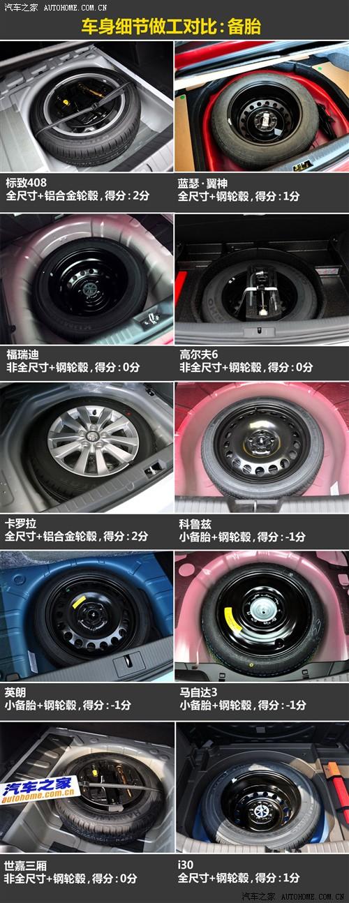 在這一環(huán)節(jié)的對比中,只有標(biāo)致408和卡羅拉使用了難得一見的鋁合金輪轂,其實408的低配車型使用的也是鋼輪轂。其他大部分車型都是鋼輪轂和非全尺寸備胎,其中值得商榷的就是福瑞迪,他全系都是195mm或者205mm的輪胎,但備胎卻都是185mm,原因當(dāng)然是為了節(jié)約成本。同時,科魯茲、英朗和馬自達3兩廂使用的小備胎對于使用有一定的影響,我們必須扣分。