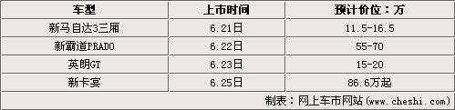 6月21日來自長(zhǎng)安馬自達(dá)的馬自達(dá)3三廂車型將會(huì)亮相一個(gè)小改款車型,在外形上這款“新”馬自達(dá)3與老款車型區(qū)別并不大,沒有改變成為進(jìn)口馬自達(dá)3車型的全新外觀,但是整車配置方面有所提升。6.22日的時(shí)候國(guó)產(chǎn)豐田越野車PRADO俗稱霸道將會(huì)推出全新一代產(chǎn)品,新款PRADO外形和內(nèi)飾上都會(huì)相比老款車型有明顯的提升,而唯一令人期待的就是它的價(jià)格了。6月23日別克的三廂緊湊型轎車英朗GT將會(huì)正式上市發(fā)布價(jià)格,而據(jù)別克內(nèi)部人士透露英朗GT的定位可能并不會(huì)太低,因此期待英朗GT定出較低價(jià)位的朋友到時(shí)候可是要重點(diǎn)的關(guān)注一下了。最后一款是保時(shí)捷在中國(guó)持續(xù)大賣的豪華SUV卡宴,據(jù)說新的卡宴在北京車展亮相之后就已經(jīng)接到了非常多的訂單,僅北京就接近200臺(tái)的預(yù)定數(shù)量,那么如果您也希望購(gòu)買保時(shí)捷新卡宴,真的要提早的去經(jīng)銷商那里提交一份訂單了。