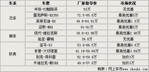 在眾多SUV車(chē)型的的范圍中,我們精選了10款各種具有獨(dú)特代表性的車(chē)型作為對(duì)象,其中囊括的日系、韓系和歐美車(chē)型,這樣更具有市場(chǎng)針對(duì)性,車(chē)型的價(jià)格范圍也從40萬(wàn)波及至80萬(wàn)元。整體呈現(xiàn)出事態(tài)強(qiáng)烈的各種狀態(tài),優(yōu)惠幅度最大的是寶馬X3車(chē)型,最高優(yōu)惠8.6萬(wàn);而在天平的另一端,加價(jià)最高的是別克昂科雷和卡迪拉克新SRX,加價(jià)額度均為3萬(wàn)元。當(dāng)然也有不加價(jià)的車(chē)型分別是豐田FJ酷路澤和起亞霸銳。