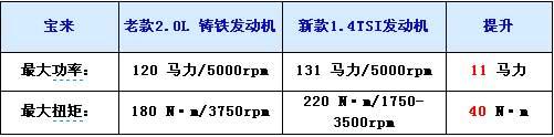 寶來(lái)2011款車型終于使用了大眾1.4T+DSG的動(dòng)力組合,1.4TSI發(fā)動(dòng)機(jī)最大功率131馬力,并可以在1750-3500轉(zhuǎn)的區(qū)間輸出220牛米的扭矩。相比那款鑄鐵的2.0L發(fā)動(dòng)機(jī),在最大功率上提高了11馬力,最大扭矩更是增加了40牛米之多。