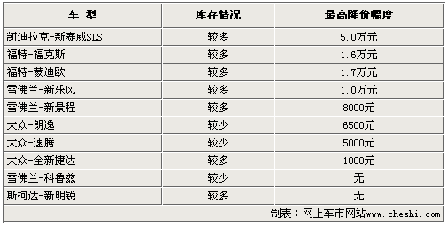我們選取了目前市場上熱銷的大眾朗逸、福特?怂沟10款車型。經(jīng)過我們在北京市場的調查后發(fā)現(xiàn),這些車型目前的庫存量較上個月均有所上升,大部分車型的價格開始出現(xiàn)松動,最高降幅達5萬元。而也有部分新上市不久的車型價格仍然堅挺,但是現(xiàn)車明顯增多。