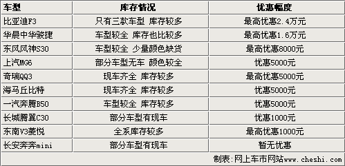 我們這次選擇了10款市場上銷售火爆的自主品牌車型,比如比亞迪F3、駿捷、奇瑞QQ3等車型。通過對北京市場的調(diào)查發(fā)現(xiàn),東南V3菱悅CVT、騰翼C30等新車型上市后,現(xiàn)車都能很快進(jìn)入終端市場,而且出現(xiàn)了一定的優(yōu)惠幅度。而比亞迪F3、駿捷等熱銷車型,也隨著新老產(chǎn)品的更新?lián)Q代,庫存壓力變大,從而使優(yōu)惠幅度也變的更多。