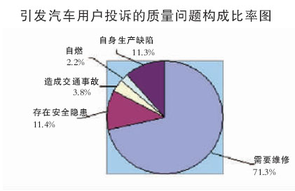 在汽車質(zhì)量投訴方面,對(duì)發(fā)動(dòng)機(jī)、變速器、轉(zhuǎn)向系統(tǒng)等核心部件的投訴比例下降,但對(duì)輪胎、車身附件、空調(diào)系統(tǒng)的投訴比二季度有明顯增加,安全隱患、生產(chǎn)缺陷的比率有所上升。各類投訴按程度分別為:需要維修才能使用的占71.3%,汽車質(zhì)量問題存在安全隱患的占11.4%,因質(zhì)量問題造成交通事故的占3.8%,自燃的占2.2%,廠家自身生產(chǎn)缺陷占11.3%。
