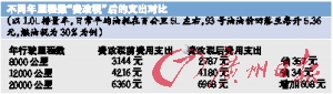 可以看出,按照現(xiàn)行油價(jià)計(jì)算,對于大部分車主來說,燃油稅率越高,所需支付的燃油部分的養(yǎng)車成本比重將更高;對于不同車型來說,排量越高,費(fèi)改稅之后所需要支出的費(fèi)用也越多;對于相同車型來說,每年行駛里程數(shù)越多,費(fèi)改稅之后所需要支出的費(fèi)用也越多。即使在燃油稅開征后,93號(hào)油油價(jià)回落至今年年初的每升5.36元,對于一輛一年行駛10005公里、油耗在5.0L每百公里左右的1.0L排量小車來說,在費(fèi)改稅之后,還是需要多支付200多元油錢。