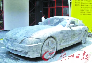 據(jù)介紹,該作品由現(xiàn)代藝術(shù)家戴耘歷時一年多創(chuàng)作完成。記者發(fā)現(xiàn),其輪胎、方向盤、排氣管,甚至連車標(biāo)都是用磚頭精心打磨而成。該創(chuàng)意園的工作人員介紹,這部車除了不能開之外,外形酷似寶馬車,價值達(dá)70多萬元,其價位也堪比真寶馬。(鮑文娟)