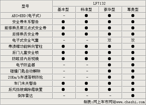 在安全配置方面,力帆320大部分車型都配備了ABS+EBD系統(tǒng)和雙安全氣囊。全系車型都帶有安全帶為系提示、后排安全帶、防眩目?jī)?nèi)后視鏡、車門未關(guān)警告和后風(fēng)擋除霜等,提高了整車的主動(dòng)安全性。另外,力帆320的高配車型還配備了倒車?yán)走_(dá)、自動(dòng)落鎖、碰撞門匙自動(dòng)解鎖裝置,也大大提高了行車的安全性。