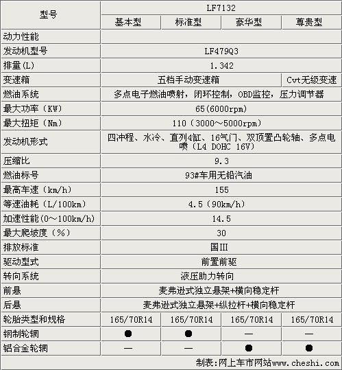 從性能方面來(lái)看,力帆320搭載自主研發(fā)的1.3升發(fā)動(dòng)機(jī),最大功率可達(dá)65kw,最大扭矩也達(dá)到了110N.m,最高車速可達(dá)155km/h,百公里等速油耗僅為4.5L。力帆320前后懸掛都采用麥弗遜式獨(dú)立懸架,并配備橫向穩(wěn)定桿,提高整車的穩(wěn)定性。輪胎型號(hào)為165/70R14,高配車型配備了鋁合金輪轂。