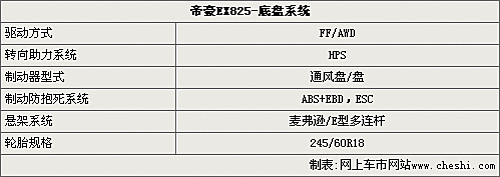 帝豪EX825不僅配備了ABS和EBD主動安全系統(tǒng),還帶有博世公司開發(fā)的ESC電子穩(wěn)定系統(tǒng),保證整車可以擁有更出色的安全性。這款車采用多連桿后獨立懸掛,配備245/60R18的寬大輪胎,使整車的運動性能也并不遜色。