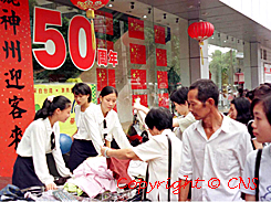 國(guó)慶節(jié)期間七天的假期對(duì)于中國(guó)內(nèi)地的許多商家來說可謂商機(jī)多多,福州閩臺(tái)商行的售貨小姐將服裝擺到店門口以方便顧客挑選。