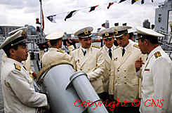 在上海訪問的俄羅斯海軍艦艇編隊(duì)官兵,十月四日在中國海軍揚(yáng)子江碼頭參觀中國新型的海軍導(dǎo)彈驅(qū)逐艦和護(hù)衛(wèi)艦。