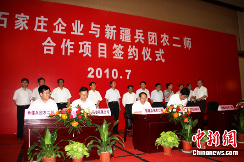 27日至30日,黃金忠一行揮師河北省會石家莊,在河北會堂舉辦首次大型推介會,并考察了石家莊市的神威藥業(yè)、常山紡織集團(tuán)和偉天實(shí)業(yè)。盡管官方目前尚未公布簽約數(shù)據(jù),但已知農(nóng)二師和石家莊市三家企業(yè)“結(jié)緣”,順利簽訂了合作協(xié)議。根據(jù)協(xié)議,常山紡織集團(tuán)將在農(nóng)二師開展棉花資源基地建設(shè)和29團(tuán)棉紡企業(yè)的升級、擴(kuò)建,神威藥業(yè)在該師建設(shè)中草藥基地并建立長期戰(zhàn)略合作關(guān)系,而河北偉天實(shí)業(yè)則與農(nóng)二師合作建設(shè)電廠。