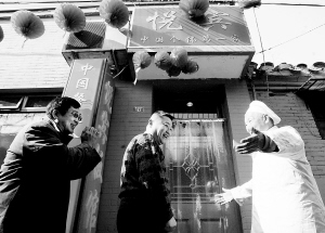 昨日下午,記者來到翠花胡同內的悅賓飯店門口,正碰見76歲高齡的郭培基老漢穿著白色的廚子衣服,頭戴高高的廚子帽,吆喝著迎接每一位顧客。郭培基說,過年了,自己“很興奮”,“闊別十來年的廚子帽今天特意戴上,就為迎接2008年的春節(jié)!弊哌M店內,郭培基看著擠滿了座位的食客們,高興得合不攏嘴。“百分之九十以上都是我多年的老主顧!痹捯粑绰洌蛔李櫩痛舐暻蠊舷壬姿蛢傻滥檬植,老郭一口應允。一位姓張的顧客說,他到老郭店里吃飯已有十余年了,“老郭手藝很好,店里的飯菜也很便宜。我們要求賞道菜,老郭從不含糊!”