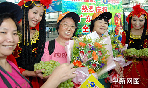 中新網(wǎng)廣州7月31日電 (莫非 林月明)在廣州白云機場出發(fā)廳,身著漂亮維族服飾的姑娘熱情地將繽紛美麗的鮮花送給游客,盛情邀約廣東游客赴美麗的新疆旅游。這是自“7·5”事件后,廣東首批赴新疆旅游的游客上航班前經(jīng)歷的一幕,意味著暫時停滯了近一個月的廣東新疆游市場,終于全面恢復正常。