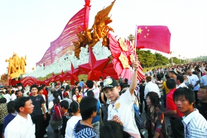 “黃金周”期間,天安門廣場人流如織,中外游客超過820萬人次,超過2008年國慶黃金周北京接待的游客總?cè)藬?shù)。北京市旅游局統(tǒng)計,北京203個主要景點接待游客的總量突破了950萬人次。