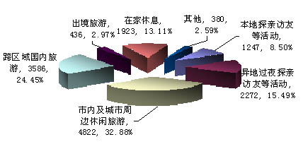 調(diào)查結(jié)果顯示,57.33%的受訪者計劃在國內(nèi)旅游,其中:32.88%受訪者有意在市內(nèi)及城市周邊休閑旅游,24.45%的受訪者有意跨區(qū)域國內(nèi)旅游;2.97%的受訪者計劃出境旅游;23.99%的受訪者有意探親訪友,其中:15.49%的受訪者計劃異地過夜探親訪友;13.11%的受訪者計劃在家休息。