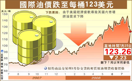 勇闖150美元/桶關(guān)口未果,國際原油價格連日來大幅下挫。上周最后一個交易日(7月25日),紐約商品交易所原油期貨價格跌至每桶123美元水平,創(chuàng)下7周以來新低。與本月11日創(chuàng)下的每桶147.27美元的盤中歷史最高紀(jì)錄相比,紐約商品交易所原油期貨價格在半個月內(nèi)已累計(jì)下跌超過24美元。