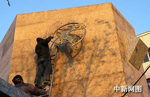 下午四時三十分許,記者在石家莊市和平西路三鹿集團(tuán)總部看到,兩名工人開始拆除門口警衛(wèi)室旁東西方兩側(cè)的“三鹿”標(biāo)志?偛块T口“石家莊三鹿集團(tuán)股份有限公司”的字樣已經(jīng)被拆除,只留下模糊的痕跡依稀可辨。
