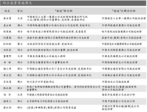 2008年7月8日,國資委發(fā)布消息,將面向海內(nèi)外公開招聘16名央企高管,這已是國資委第6年公開招聘央企領(lǐng)導(dǎo)。據(jù)統(tǒng)計(jì),前5年,通過這種方式一共招聘了91名高管。那么,這些高管現(xiàn)狀如何,這種“海選”的方式是否科學(xué)有效?