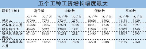 工資增長幅度最大的5個工種分別是模具工,增長了56.53%,年平均工資達(dá)到了41151元;設(shè)備保全人員,增長了48.64%,年平均工資達(dá)到了49166元;印后制作工,增長了47.04%,年平均工資達(dá)到了20879元;通訊交換設(shè)備調(diào)試工,增長了42.31%,年平均工資為33517元;模具工程技術(shù)人員,增長了41.86%,年平均工資高達(dá)87119元。(具體工資情況可見表格)