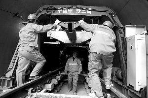 “目前的鋪軌技術(shù)是國內(nèi)最先進的,25米的鋼軌在地面形成軌排,然后機械下到地下進行鋪裝。”中鐵一局軌道項目經(jīng)理表示,目前一個基地每天的鋪軌進度是150米!28公里的軌道線上,8.5公里路段采用了減震處理!痹撠撠熑吮硎,4號線是北京減震處理最多的一條地鐵。