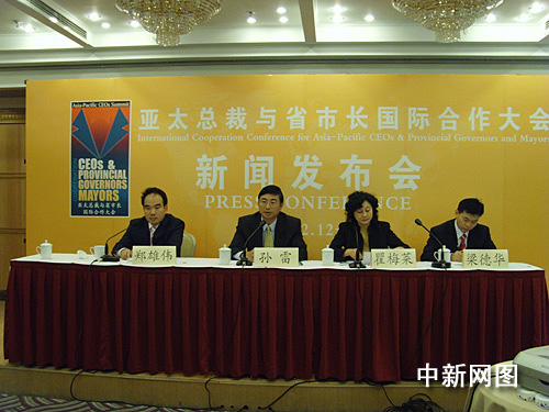中新網(wǎng)11月28日電 今日下午,亞太總裁協(xié)會(huì)與廣州市人民政府聯(lián)合在京宣布:第三屆亞太總裁與省市長(zhǎng)國(guó)際合作大會(huì)將于今年12月12日-14日在中國(guó)第三大經(jīng)濟(jì)中心城市廣州市隆重舉辦。亞太總裁協(xié)會(huì)全球執(zhí)行主席鄭雄偉及第三屆亞太總裁與省市長(zhǎng)國(guó)際合作大會(huì)組委會(huì)辦公室主任、廣州市對(duì)外貿(mào)易經(jīng)濟(jì)合作局副局長(zhǎng)孫雷等出席了當(dāng)天發(fā)布會(huì)并接受記者提問(wèn)。