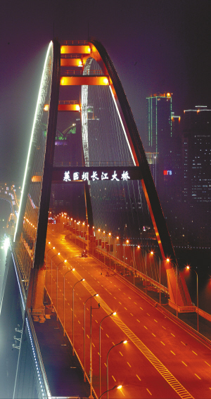 菜園壩長江大橋創(chuàng)下了三項世界第一:鋼箱拱梁跨距420米,為世界第一長;是世界第一座公路輕軌兩用城市大橋;也是世界第一座采用纜索吊機(jī)安裝的大橋。