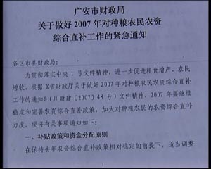 鄧永學(xué)說的每畝補(bǔ)貼25元,指的是2006年的種糧補(bǔ)貼標(biāo)準(zhǔn),根據(jù)記者了解,在武勝縣,2006年對于農(nóng)戶種植一畝糧食直補(bǔ)和綜合補(bǔ)貼總計(jì)25.12元,而在2007年,每畝補(bǔ)貼提高到了51.05元,國家的種糧補(bǔ)貼額度提高了一倍,然而,在當(dāng)?shù)兀瑖覍ΨN糧補(bǔ)貼的提高速度趕不上生產(chǎn)成本的漲價(jià)速度。