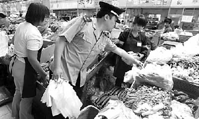 昨天上午8點(diǎn),記者在岳各莊批發(fā)市場(chǎng)附近一個(gè)早市發(fā)現(xiàn),這里的攤位沒(méi)有任何宣傳標(biāo)識(shí),很多小商販根本不知道國(guó)家限塑令的規(guī)定,仍然在使用各種顏色的超薄塑料袋。