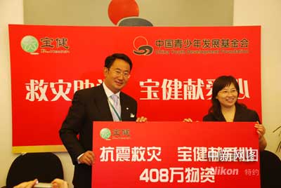 災(zāi)難發(fā)生后,寶健是第一家積極響應(yīng)中國青少年發(fā)展基金會號召進行抗震救災(zāi)助學(xué)捐款的公司。截止目前,寶健公司通過與中國青基會共同設(shè)立的“寶健自主基金”,向災(zāi)區(qū)累計捐贈的專款、物資已超過800萬元人民幣,這些款項和物資將主要用于支持希望工程、支持學(xué)生救助和學(xué)校重建,并向災(zāi)區(qū)同胞提供所需要的一些恢復(fù)體能、提高抵抗力的健康食品等賑災(zāi)工作。