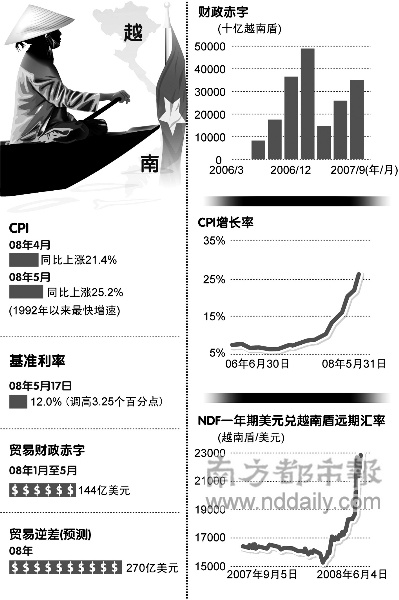 而通貨膨脹在過去數(shù)月里一直是越南經(jīng)濟決策官員的主要課題,越南當(dāng)?shù)?月份的消費者物價通脹較2007年底時的12.5%,上升超過一倍至25.2%.